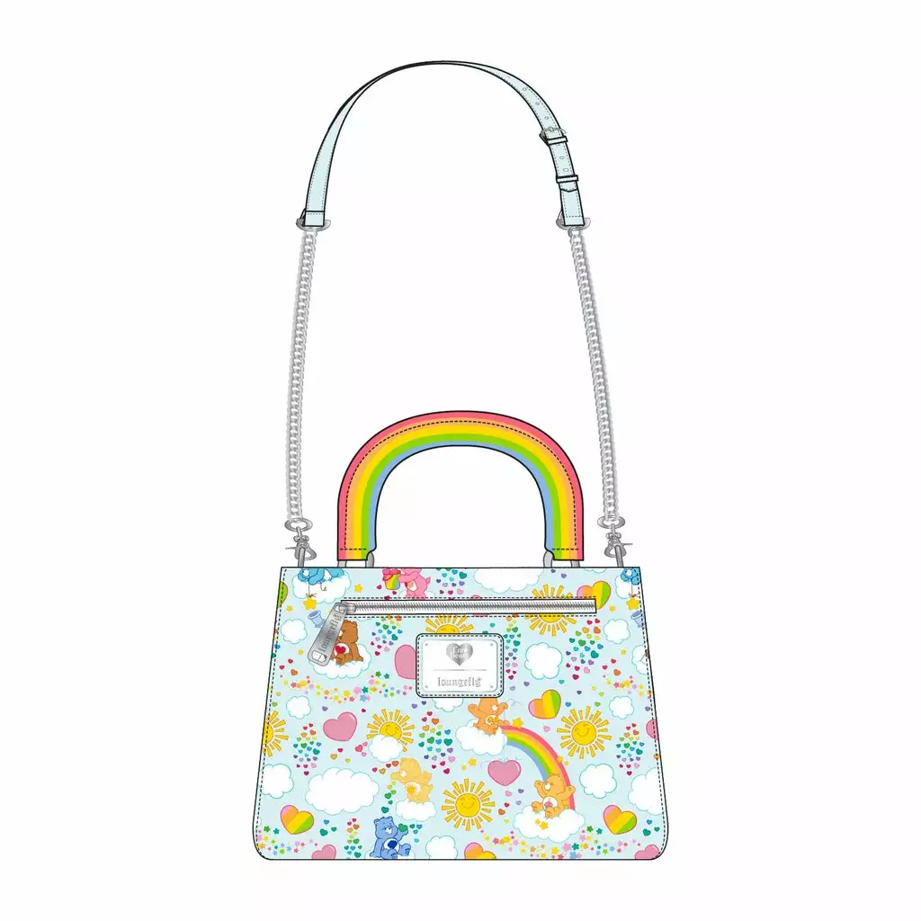 The front and back are bursting with a colorful Care Bear™ pattern that includes rainbows, smiling suns, clouds, and many adorable characters, such as Bedtime Bear, Grumpy Bear, Tender Heart Bear, Cheer Bear, Funshine Bear, and Friend Bear. Note the 40th Anniversary coordinating interior lining, which adds more rainbow pops of color. The bag, with silver-colored zipper hardware and chain shoulder strap, includes a zipper charm. The exterior features vegan leather (polyurethane). Please note: Patterns will vary with all-over-print styles. Not every piece will look identical nor will every piece be an exact match as to what is pictured online.