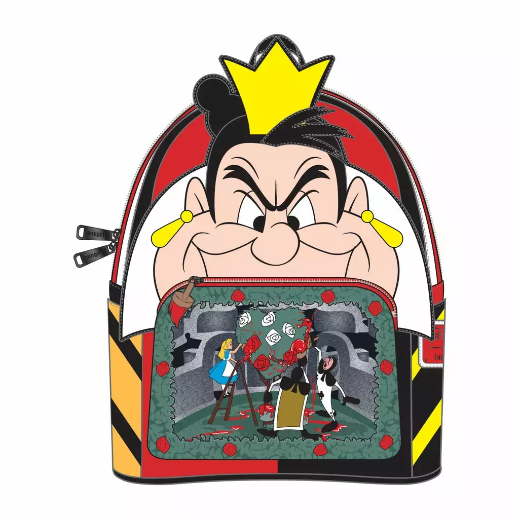 Remain in the Queen of Heart’s favor, and all is well in Wonderland. Fall out of favor, and heads will roll. Since 1951, the Queen of Hearts has reigned supreme in Disney’s Alice in Wonderland, and now she can watch over your belongings with this Loungefly Alice in Wonderland Queen of Hearts Villains Scene Mini Backpack.