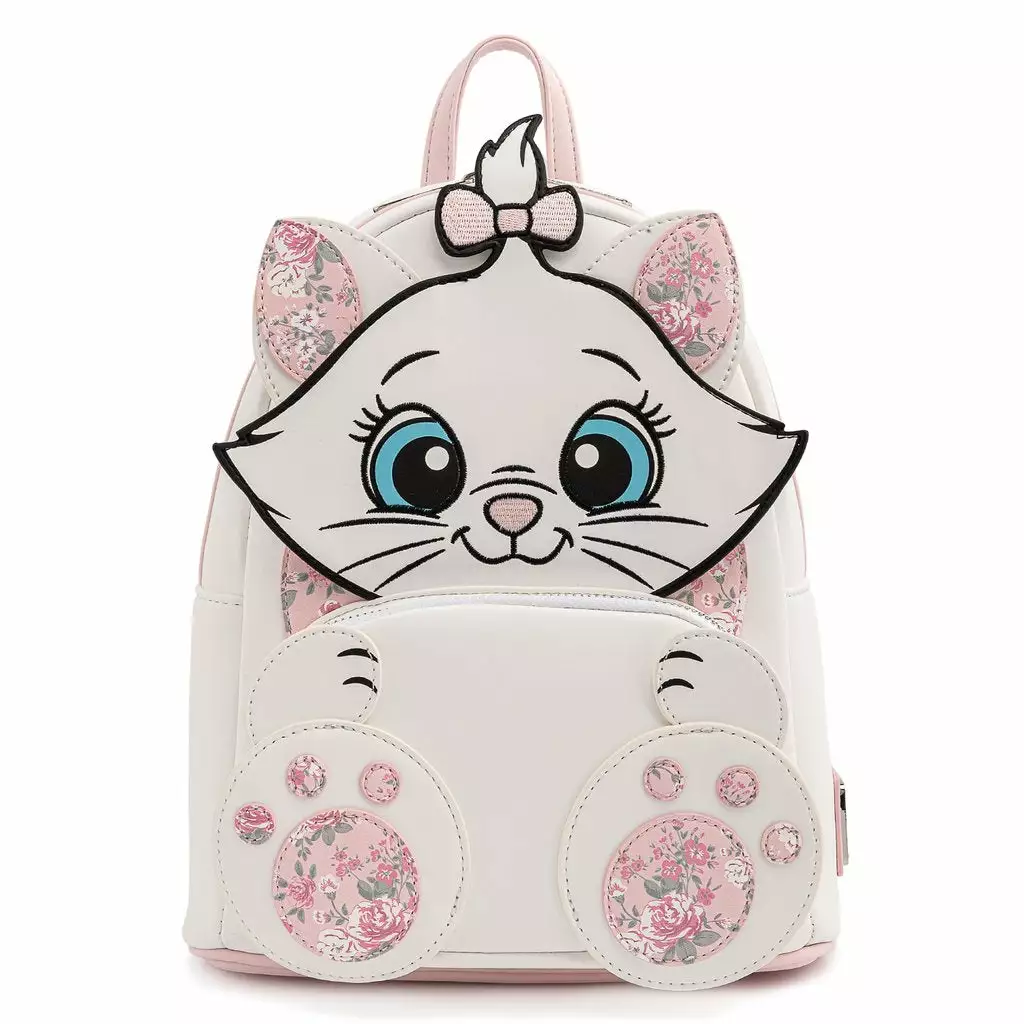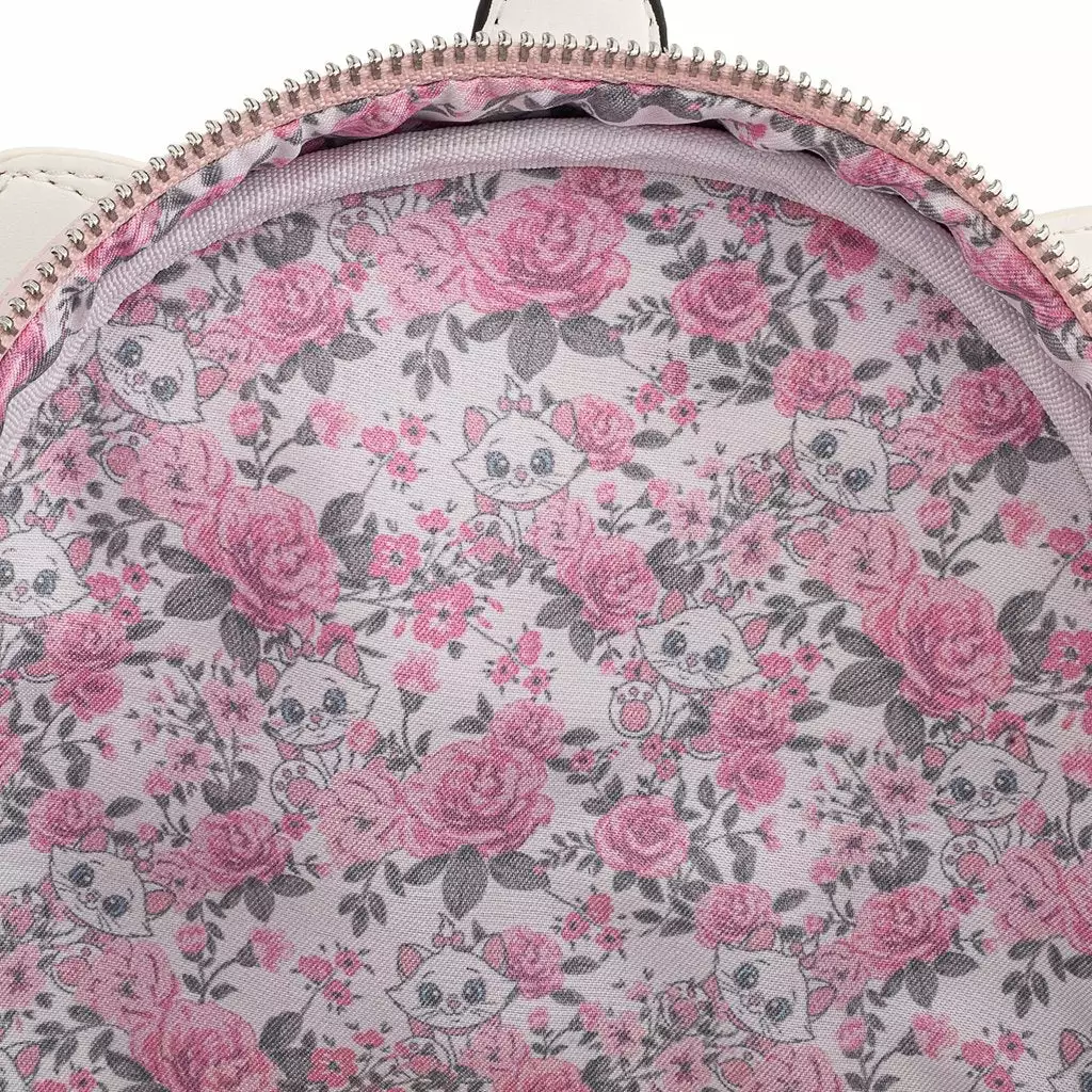 The Disney Aristocats Marie Floral Mini Backpack is made of vegan leather (polyurethane). Bag has adjustable shoulder straps, sturdy metal hardware, and features: embroidered, applique, and printed details. Take note of the coordinating pattern of the inside lining fabric.