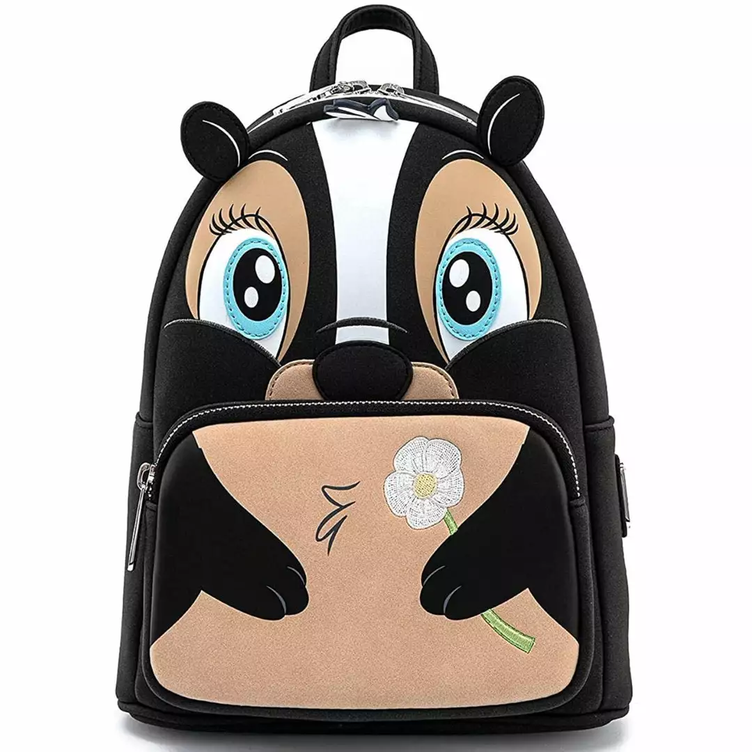 The Disney Bambi Flower Cosplay Mini Backpack is made of vegan (polyurethane) leather and features: adjustable shoulder straps, sturdy metal hardware, enamel zipper charm, applique, plush, debossed, embroidered, and printed details. Take note of the coordinating design of the inside lining fabric.