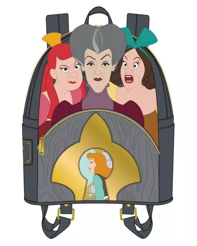 They key to a villainous outfit is the accessories. The Loungefly Disney Cinderella Evil Stepmother and Stepsisters Villains Scene Mini Backpack is here to rule the roost. Through a golden keyhole you’ll find Cinderella, while her stepmother and stepsisters loom over the view with unapproving looks. On the back you’ll find Jaq and Gus carrying the key that may set Cinderella free.