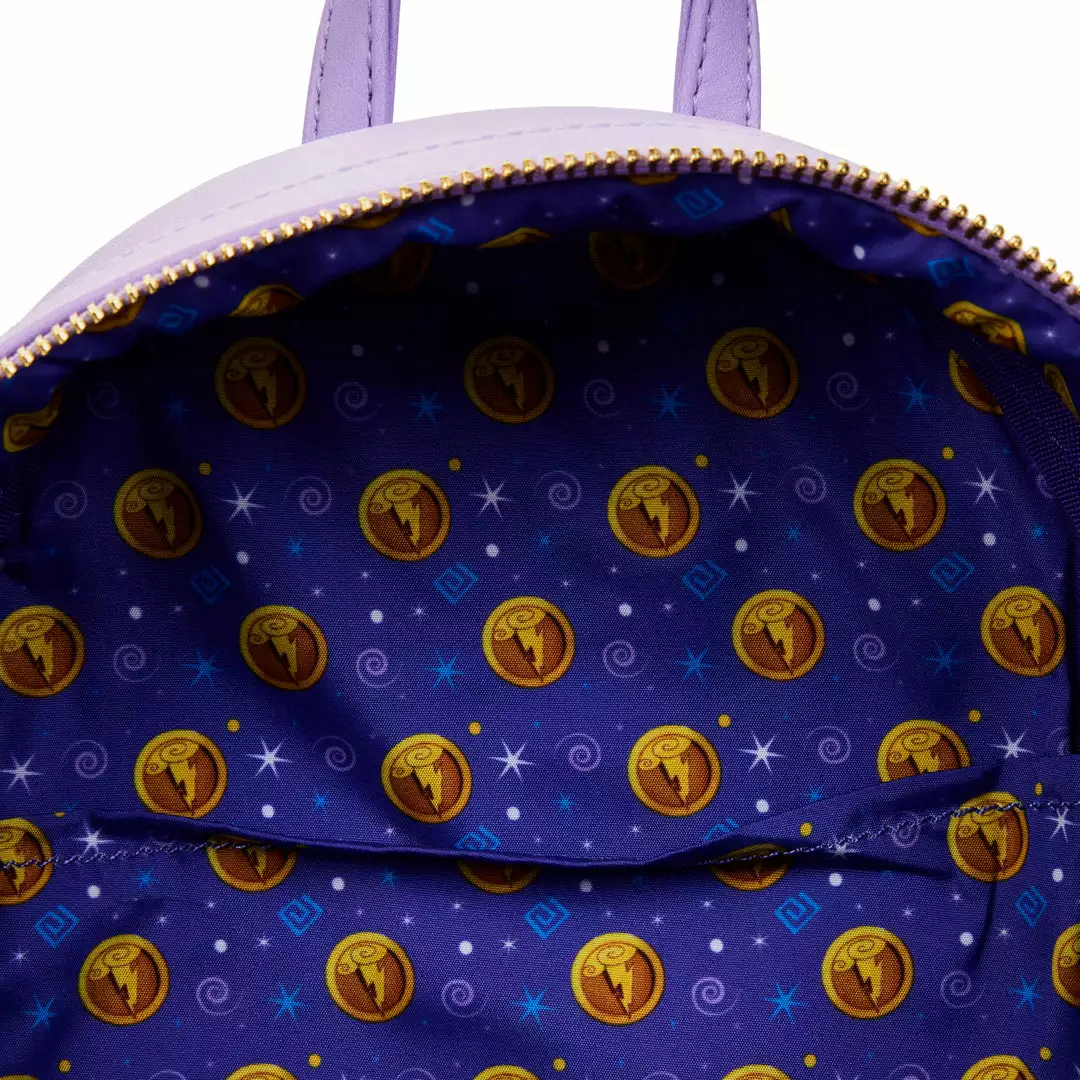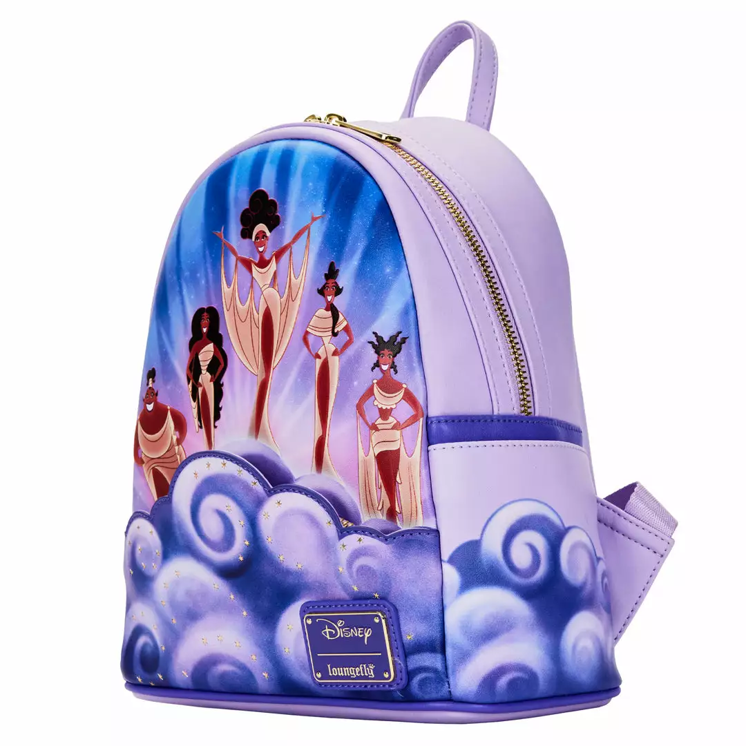 Call on the muses to add sparkle to your day with this Hercules Muses Clouds Mini Backpack. The muses from Hercules gather in a glittering display upon the clouds, against a soft violet background, the golden rays of the sun shining through. In fact, the front zipped compartment is cloud-shaped too! This darling design adds ease and shimmering interest to your travels. On the back, Hercules’ golden lightning bolt symbol shines, and the words “Zero to Hero” appears. Take these muses with you to inspire all of your journeys.