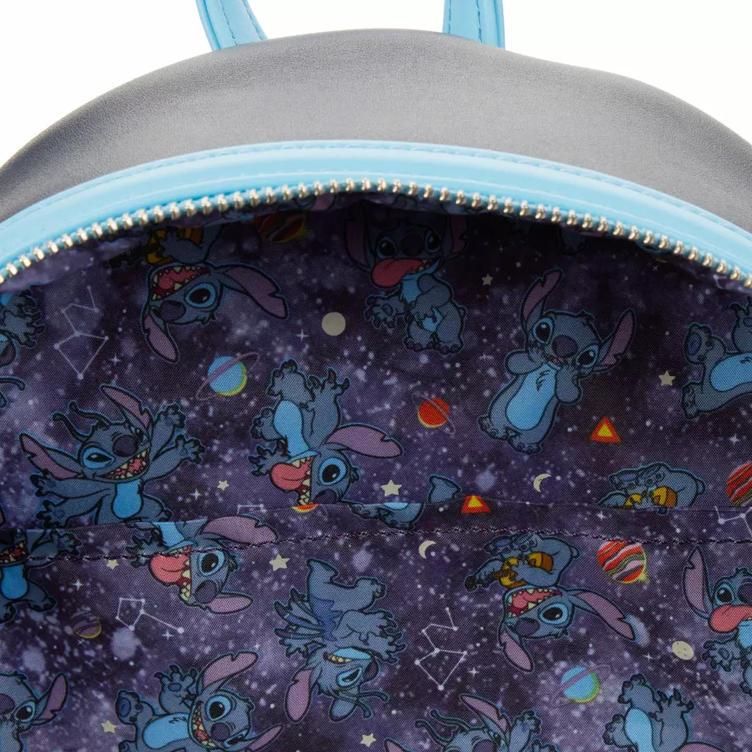A coin-operated rocket ride provides out-of-this-world adventure for one imaginative duo. Have a blast taking Lilo and Stitch with you as this Lilo & Stitch Space Adventure Glow in the Dark Mini Backpack. On the front of the backpack, Lilo and Stitch have managed to fly to outer space in the coin-operated “Space Adventure” rocket ship. The stars in the background glow in the dark! Lilo is having too much fun to notice that the ride might be a bit much for Stitch to handle. On the back side, planets and stars surround the words “Space Adventure.” In fact, the planet and star glow in the dark.