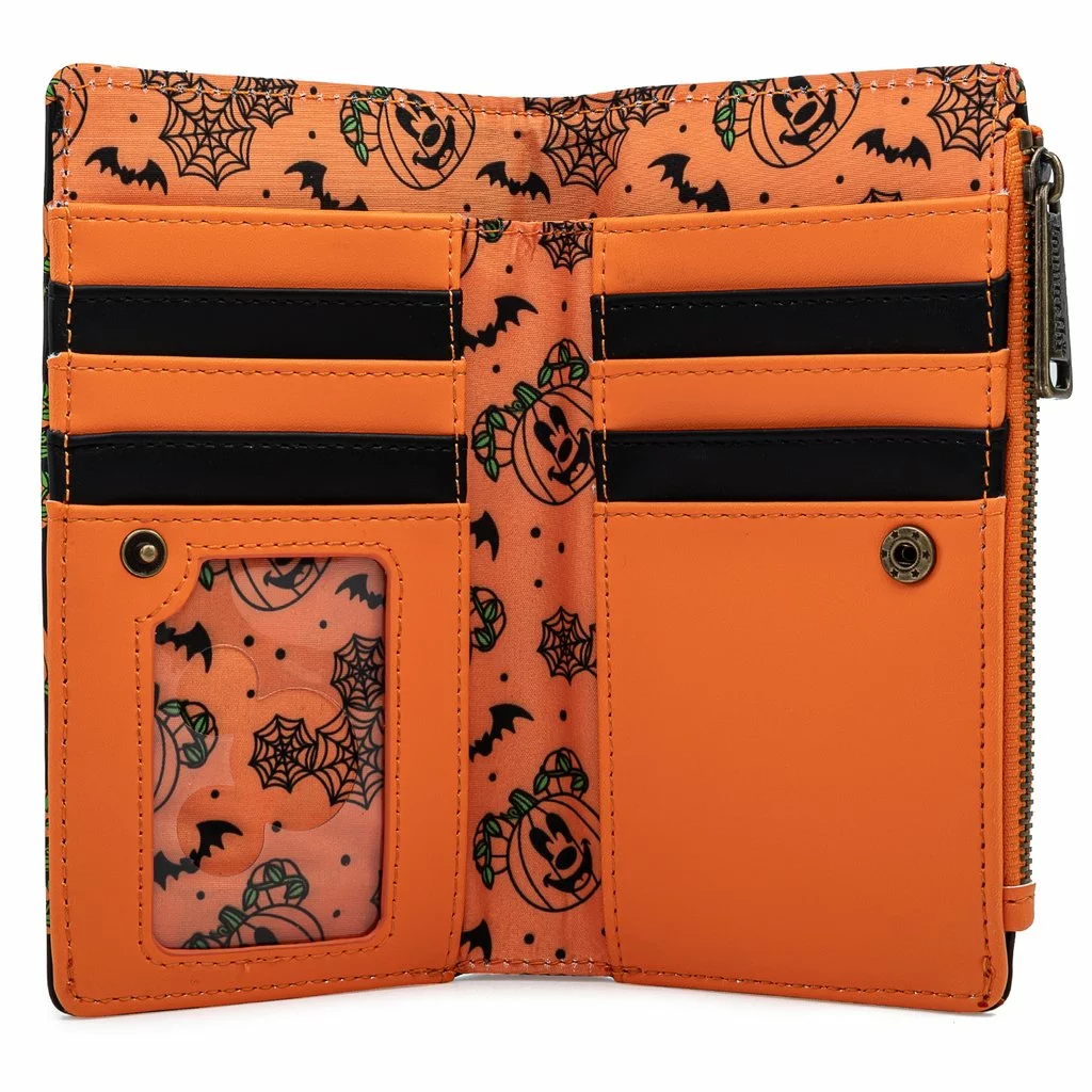 It’s a not so scary pattern, for an oh so sweet season! Loungefly’s Disney Mickey-O-Lantern Glow in the Dark Flap Wallet makes for an adorable Halloween/autumn accessory! This wallet’s pattern features Mickey Mouse as a jack-o-lantern and has glow in the dark details! It makes a great complement to an autumn-themed outfit or a fun accessory for everyday use.