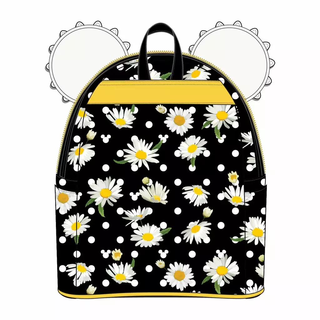 Get ready for spring with the Minnie Mouse Daisy Mini Backpack! The white daisies and polka dots stand out against the black background, adding a bright yellow zest to spring or even summer outfits. Between the daisy covered ears is a bright yellow bow, tying together the whole look. This bag will help you brighten the new year!