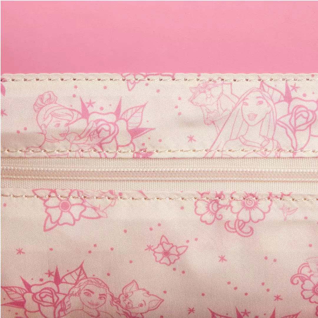Princess power is in full bloom. Take the strength and charm of the Disney Princesses with you wherever you go with this Disney Princess Floral Tattoo Crossbody Bag. A classic tattoo style rose debossed motif punctuates the cream-colored background on this bag. The following Disney princesses can be found among the flowers: Mulan, Cinderella, Snow White, Belle, Moana, Aurora, Ariel, and Tiana. Pink accents, including a pink-colored ombre chunky chain shoulder strap and lacey details fashioned from vegan suede, frame the motif. This crossbody bag is the perfect complement to any Disney outfit.