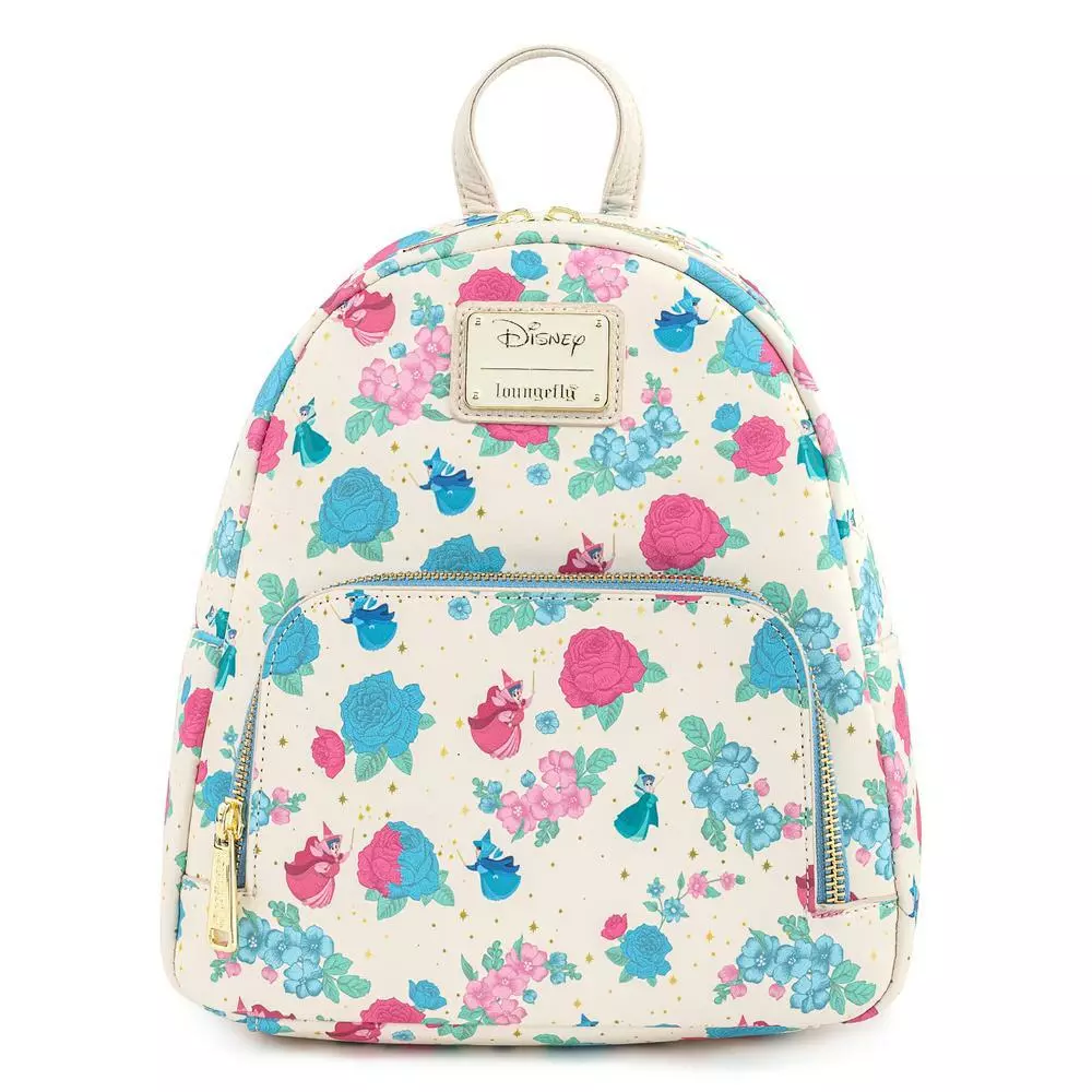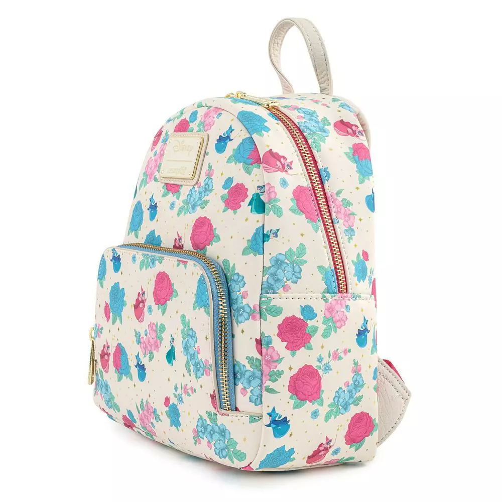 Fauna, Flora, and Merryweather battle over whether the outfit and accessories should be pink or blue on Loungefly’s Sleeping Beauty Floral Fairy Godmothers Mini Backpack. This bag is the perfect accessory for an urban Aurora Disneybound outfit, or just an awesome everyday bag to carry all your necessities.