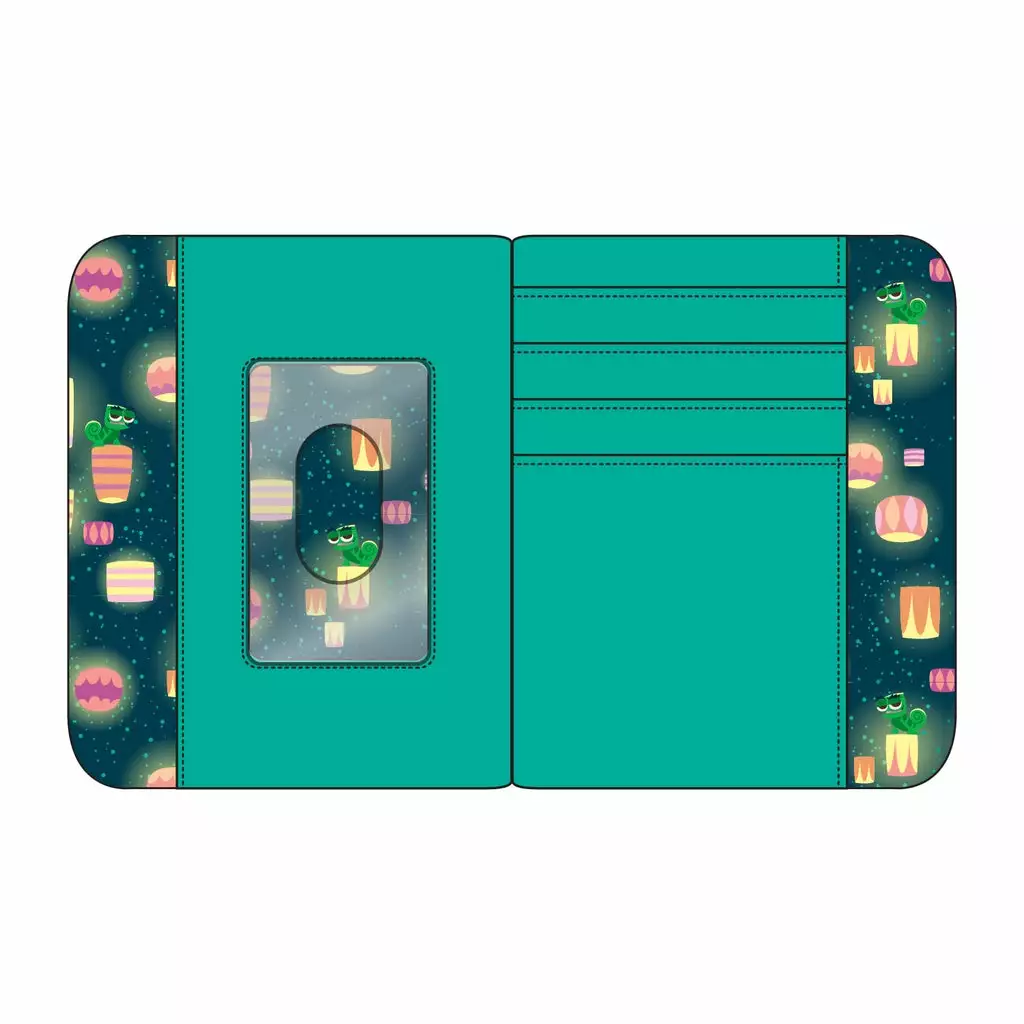The front of the wallet shows the moment when Rapunzel and Flynn take a gondola ride on Rapunzel’s birthday so that she can see the illuminations up close. Lanterns light up the sky in this magical scene, and the castle glows in the background. In fact, the lanterns and windows have glow-in-the-dark details. On the back, the entire family embraces to celebrate Rapunzel’s return. Note the coordinating lining, which carries a motif of lanterns in the night sky. It’s the perfect accessory to complement any Disney outfit. Wallet features include the following details: vegan leather (polyurethane), gold-colored zippers and metal hardware, and applique and printed work.