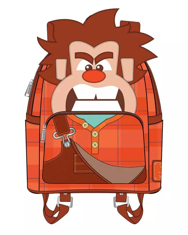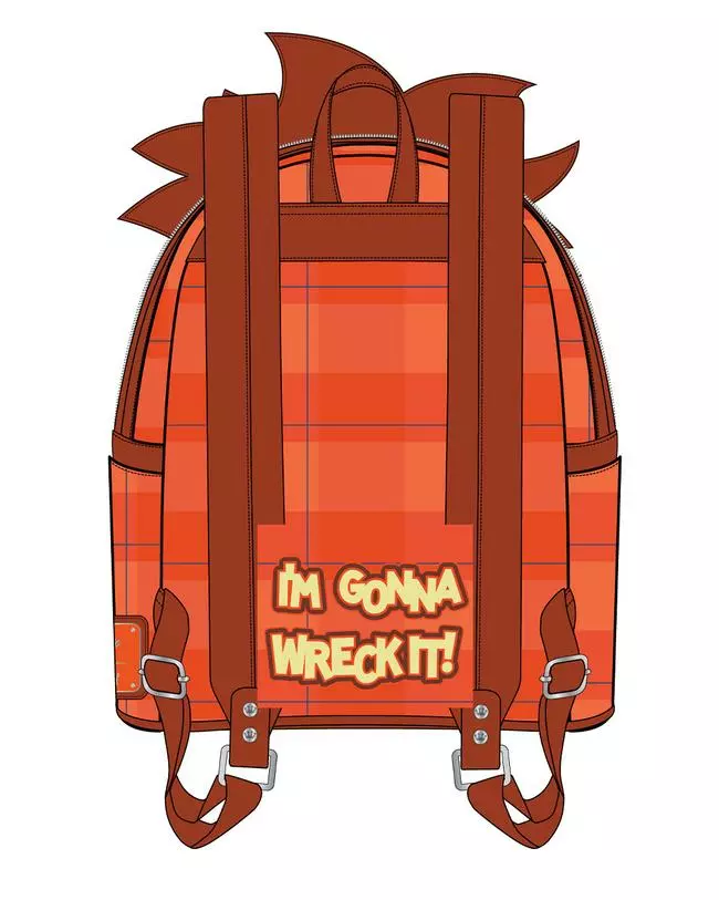 Wreck-It Ralph Cosplay Mini-Backpack! It is made of faux leather and features a top zipper closure and front zippered pocket, adjustable straps, matching themed lining, denim and faux leather applique, metal buckle, button, embroidered, debossed, and printed details. This mini-backpack approximately measures 9-inches wide x 10 1/2-inches tall x 4 1/2-inches deep. Ages 15 and up.