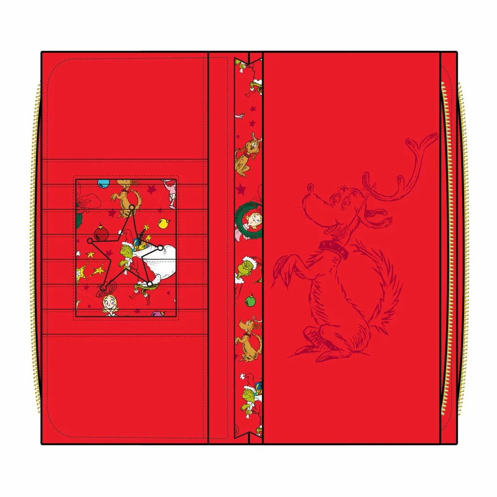 Who-ville is about to get a shock when it encounters the Loungefly Dr. Seuss The Grinch Zip Around Wallet! Somehow Cindy-Lou Who has helped the Grinch see what’s so special about the holidays. On the back you’ll find Max the dog sitting on the sled. Humbugs and holiday heroes alike will love this wallet.