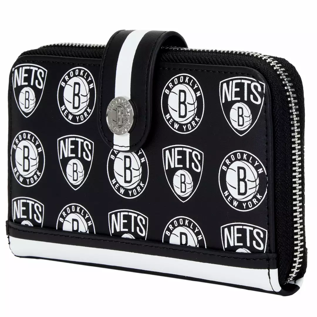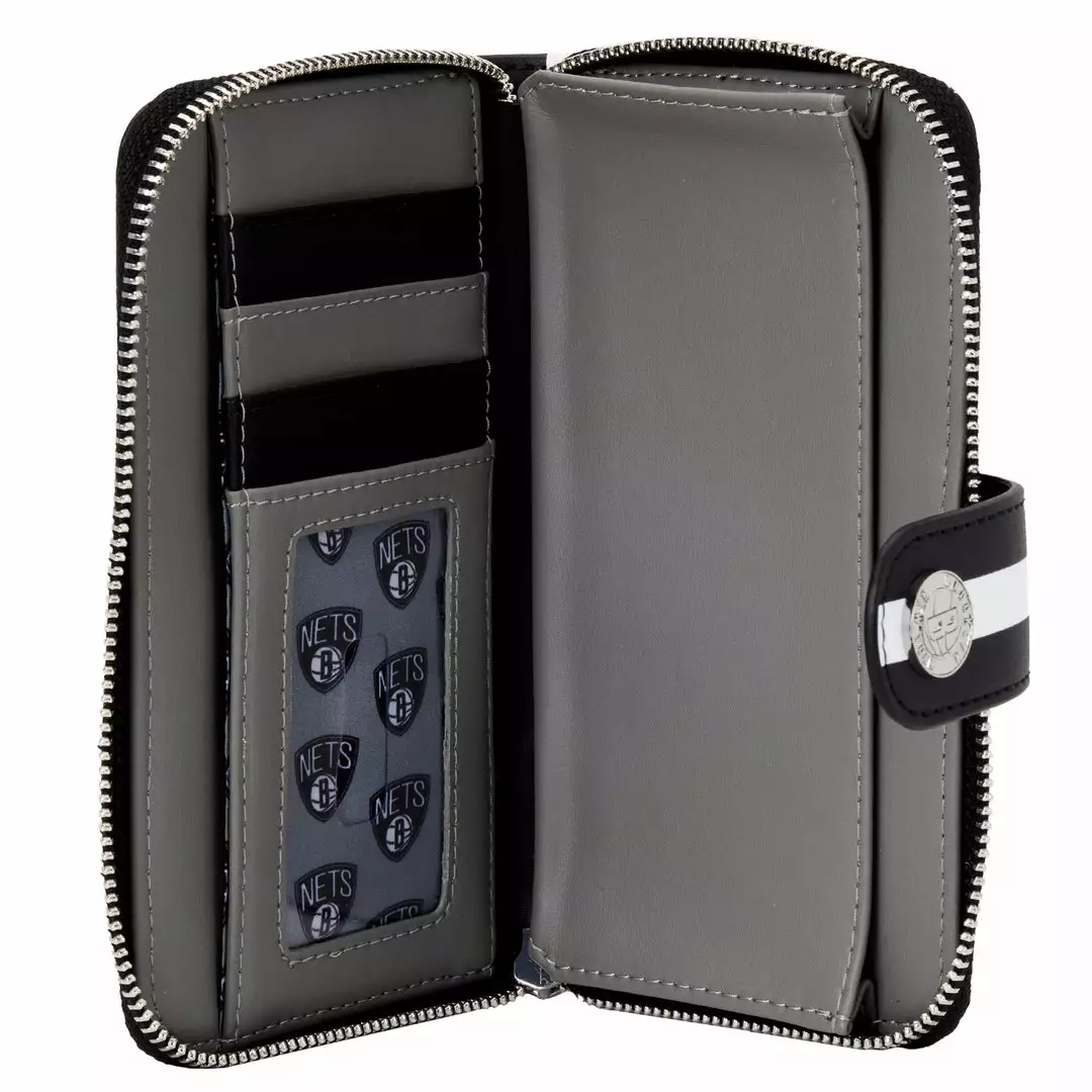 Create a winning game plan that shows your team spirit with this NBA Brooklyn Nets Logo Zip Around Wallet. This vegan leather (polyurethane) wallet carries a motif of alternating logos for the Brooklyn Nets team. The shield and white basketball logo for the Brooklyn Nets alternates with the black B, encircled by “BROOKLYN NEW YORK,” logo.