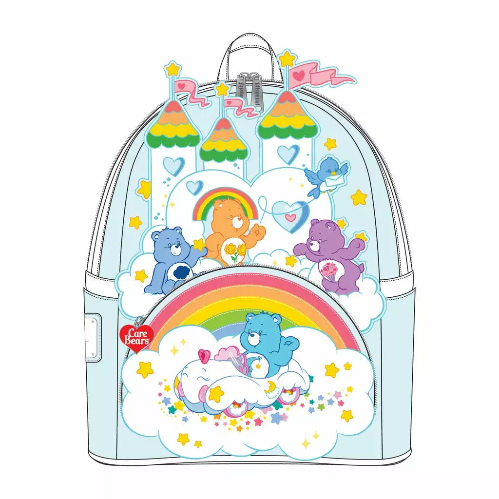 The Caring Meter is set all the way to “rainbow” in the Kingdom of Caring. Take the sunshine with you when you wear this 40th Anniversary Collection Loungefly Care Bears™ 40th Anniversary Mini Backpack. The Care Bears™ have gathered around the Care-A-Lot Castle to spread love and joy.