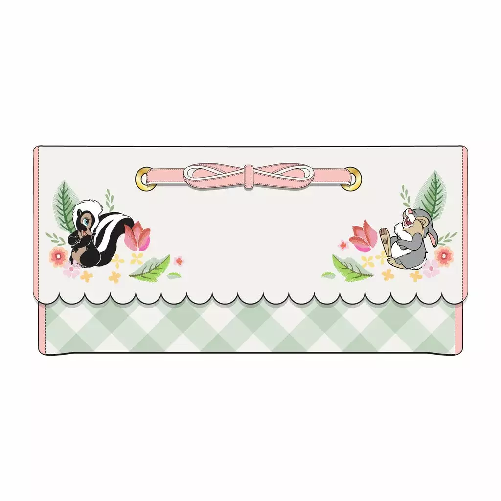 Embark on rejuvenating spring escapades Bambi and friends with the Bambi Spring Time Tri-Fold Wallet! The design features Flower, Thumper, wildflowers, and foliage motifs. On the front you’ll find a decorative pink bow, as well as Thumper and Flower among ferns and wildflowers. The back has embroidered flowers over the soft green and cream-colored gingham pattern. The wallet has 6 slots for holding cards, and a clear window slot for holding your ID. It’s a delightful design that is a must have for any Bambi collection.