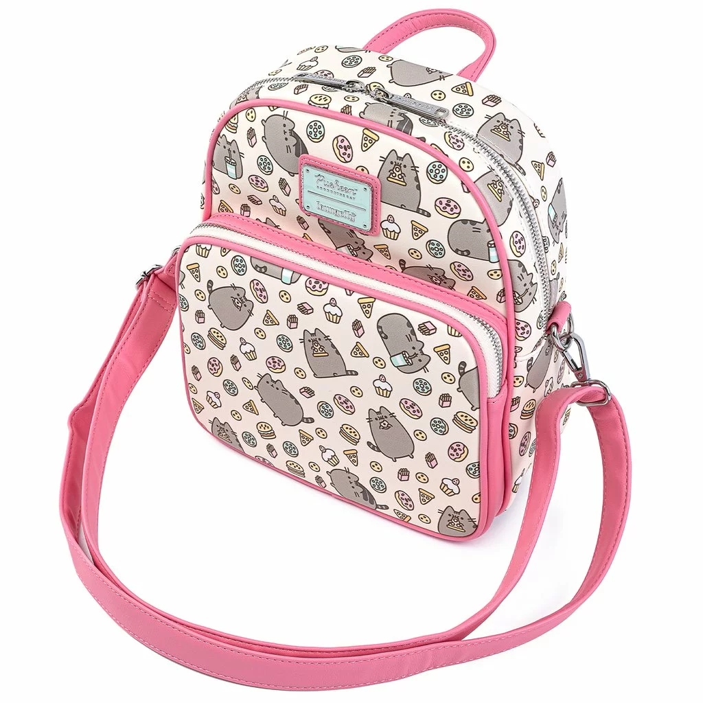 Pusheen is a tubby tabby cat who brings smiles and laughter to people all around the world. This vegan leather convertible mini backpack includes printed, removable/adjustable straps, interior lining and metal plaque details. Dimensions: W: 9″ X H: 10″ X D: 4.5″