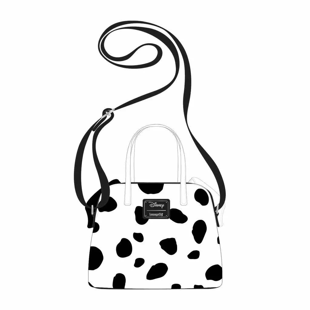 The Loungefly Disney 101 Dalmatians 60th Anniversary Cosplay Crossbody Bag is made of vegan leather (polyurethane). Bag has an adjustable shoulder strap, sturdy metal hardware, and features: applique, embroidered, and printed details. Take note of the coordinating pattern of the inside lining fabric.