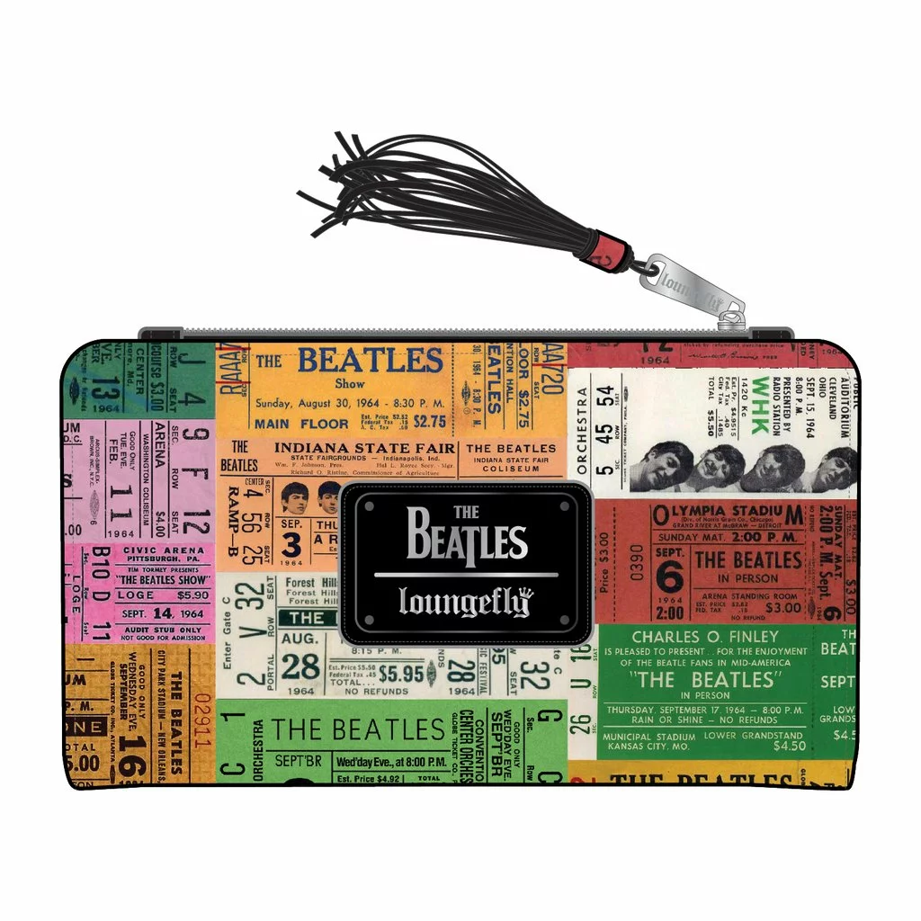 The The Beatles Ticket Stubs Flap Wallet is made of vegan leather (polyurethane). Wallet snaps closed, has a zipper pocket and sturdy metal hardware, and features: vegan leather tassel, and printed details. Take note of the coordinating pattern of the inside lining fabric.